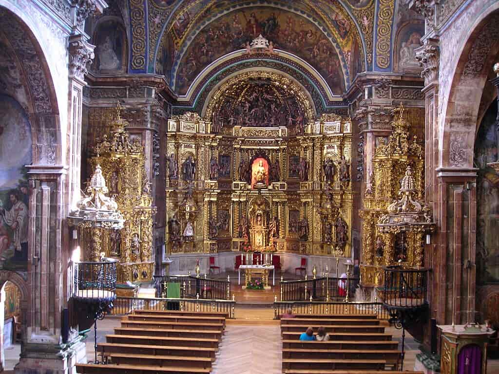 Al cruzar el umbral, el peregrino queda maravillado por sus retablos dorados, bóvedas pintadas y capillas llenas de arte sacro. La torre campanario, de estilo gótico-renacentista (siglo XVI), se alza esbelta sobre el conjunto, guiando a los caminantes desde la lejanía.