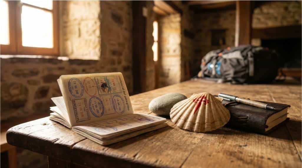 Die Credential dient als Durchgangsdokument und Erinnerung. Jeder Stempel ist eine Szene: eine Herberge, eine Pfarrei, eine Bar, eine Begegnung. Am Ende wird für viele die Stempelseite zu einer emotionalen Landkarte der Reise.