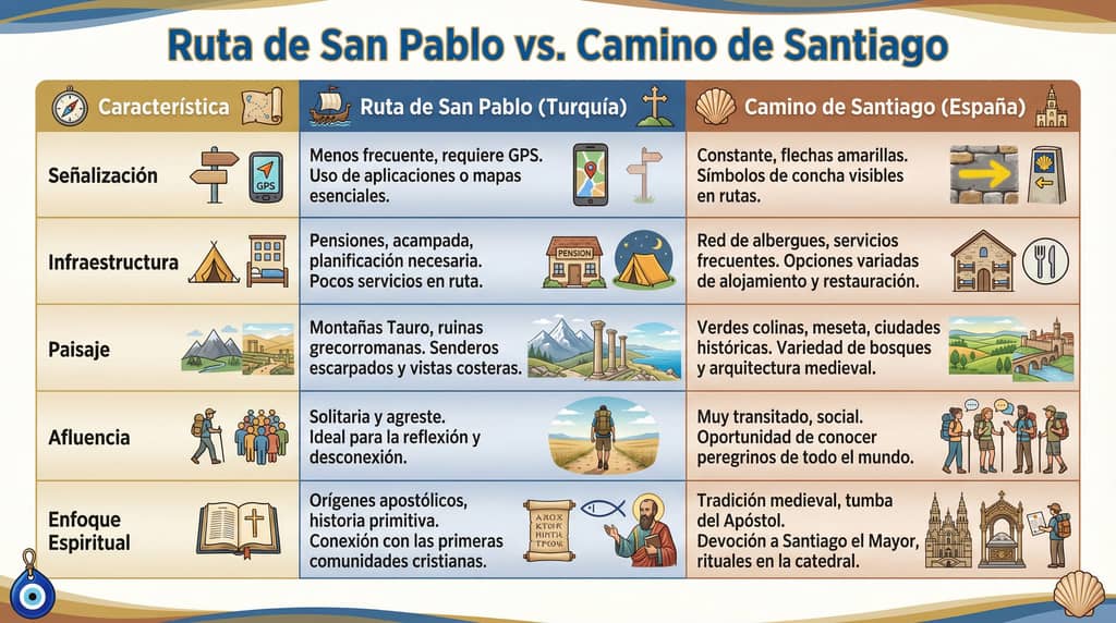 L’une des principales différences réside dans l’infrastructure. Tandis que le chemin de Saint-Jacques dispose d’un réseau dense d’hébergements, d’un balisage constant et de services adaptés aux pèlerins, la Route de Saint Paul est une expérience plus sauvage et plus solitaire. Elle exige une planification plus poussée en matière d’hébergement —combinant petites pensions de village, maisons d’hôtes et bivouac— ainsi qu’une navigation plus attentive, l’utilisation d’un GPS étant vivement recommandée.