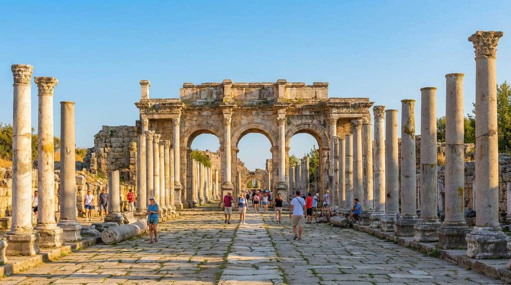 Perge est le point de départ officiel du St. Paul Trail. Ses ruines, comprenant une avenue à colonnades, un stade et des thermes, offrent une introduction magnifique à la grandeur des villes romaines de la région. Tout près, le théâtre d’Aspendos, avec son acoustique et son état de conservation presque parfaits, permet d’imaginer des milliers de citoyens assistant à des représentations il y a deux millénaires.